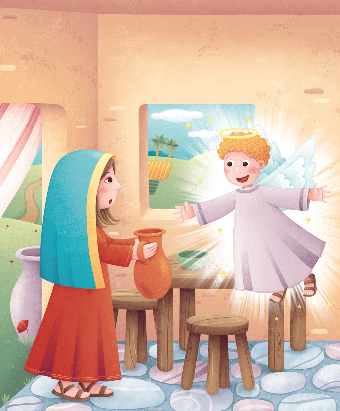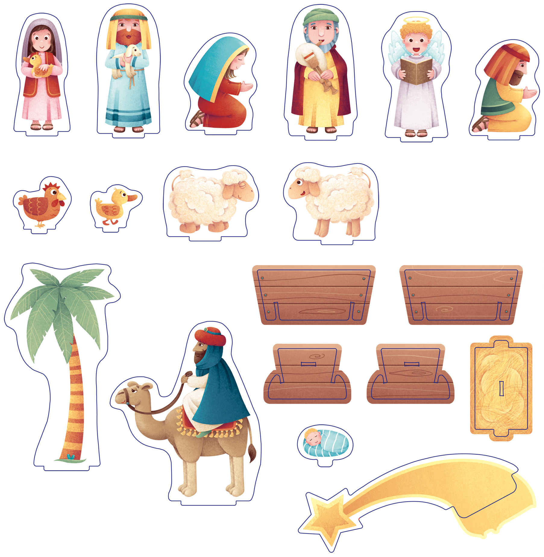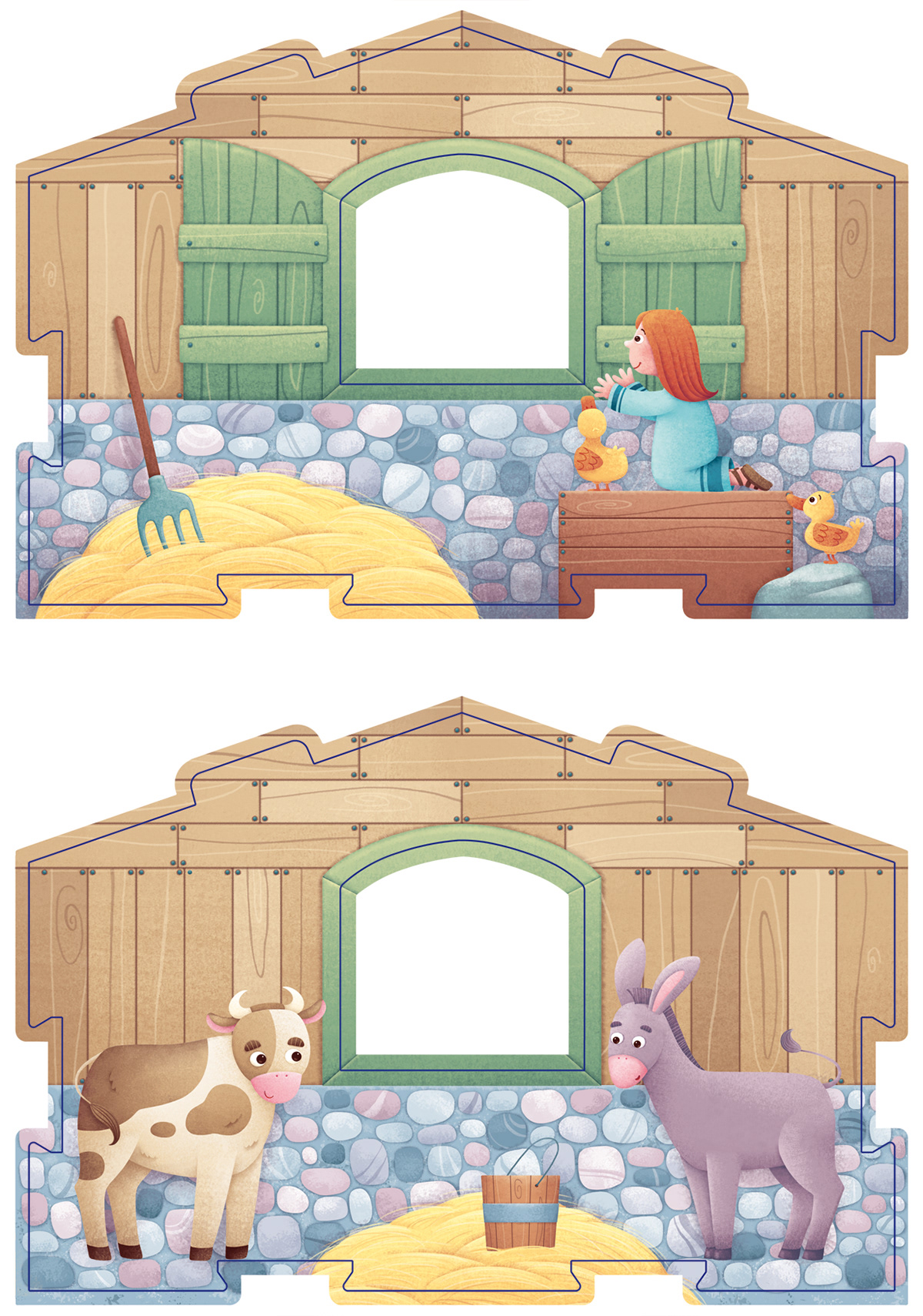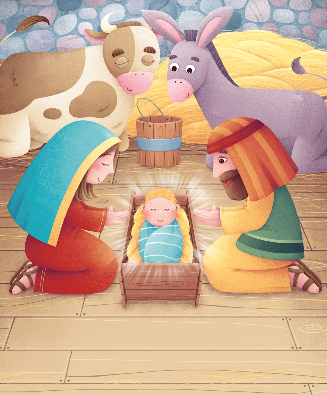 Some selected pages from the board book "Il più bel Presepe", based on the nativity of Jesus. The characters and the stable are also a puzzle: a piece on every double pages beside the story. Raffaello Ragazzi publisher.